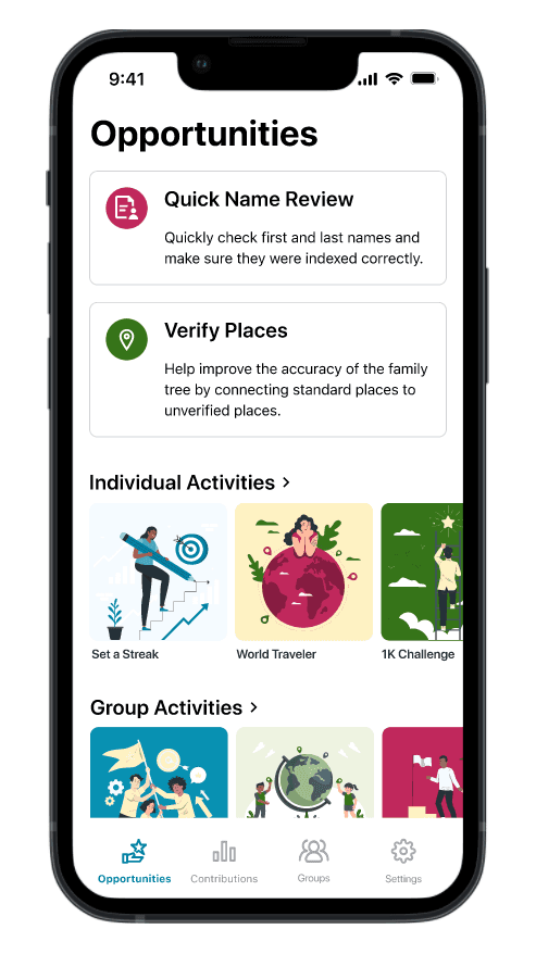 A Groups tab with in-app chats, allowing users to join friends or family in indexing activities, coordinate efforts, and encourage each other in real time.