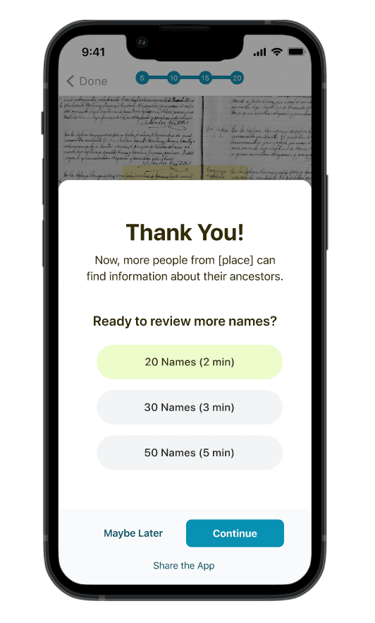 After completing 20 names, users are prompted with a question, "Would you like to review more names?" and three options: 20, 30, or 50 more names. We added time estimates next to each option to provide clearer expectations.